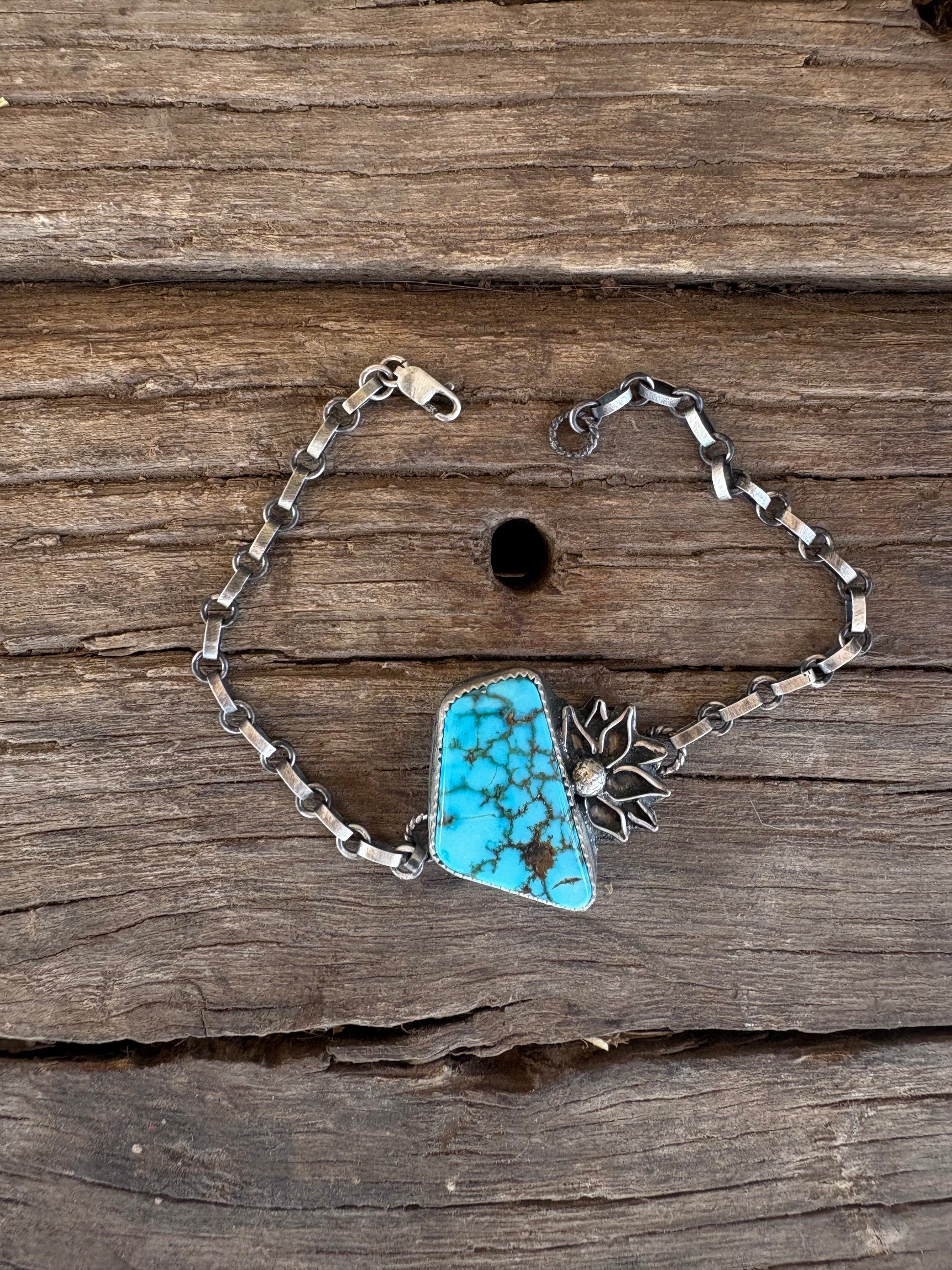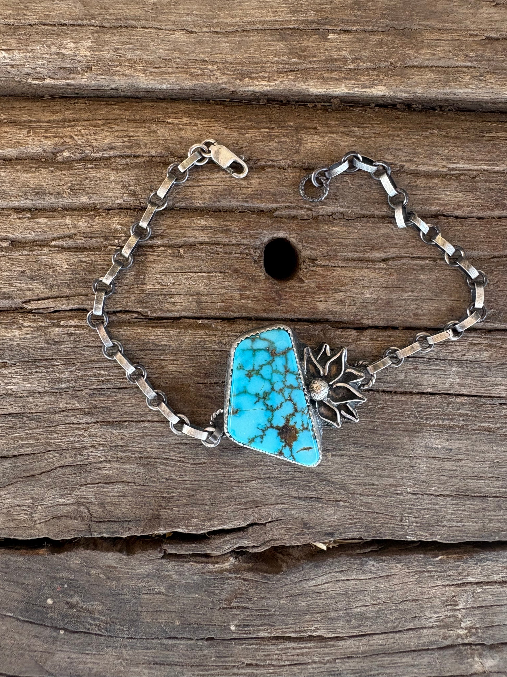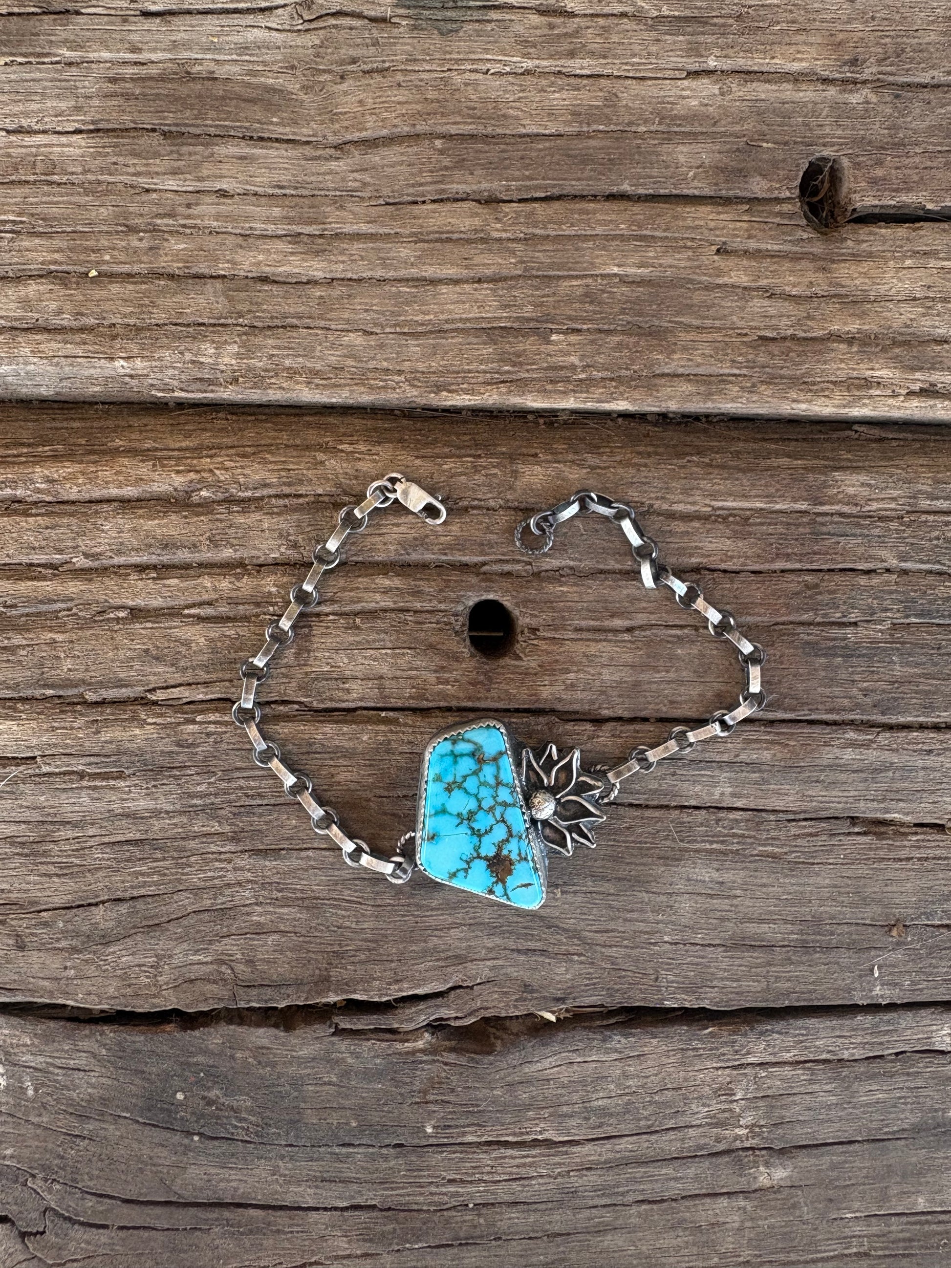 The “Alaura” is my new favorite bracelet I’m not gunna take off till it sells! She is made out of Turquoise Mountain turquoise with handmade little flower detail.