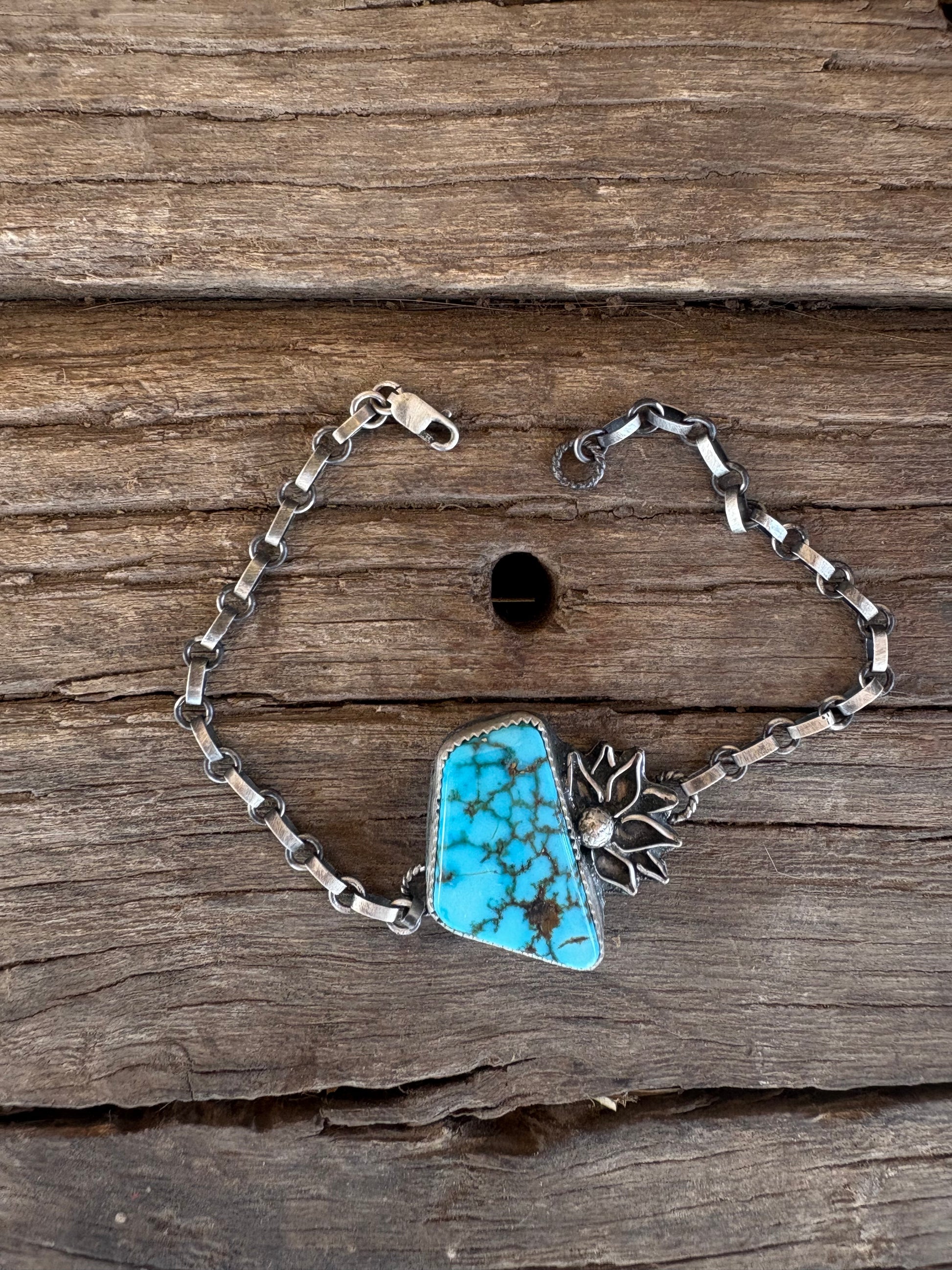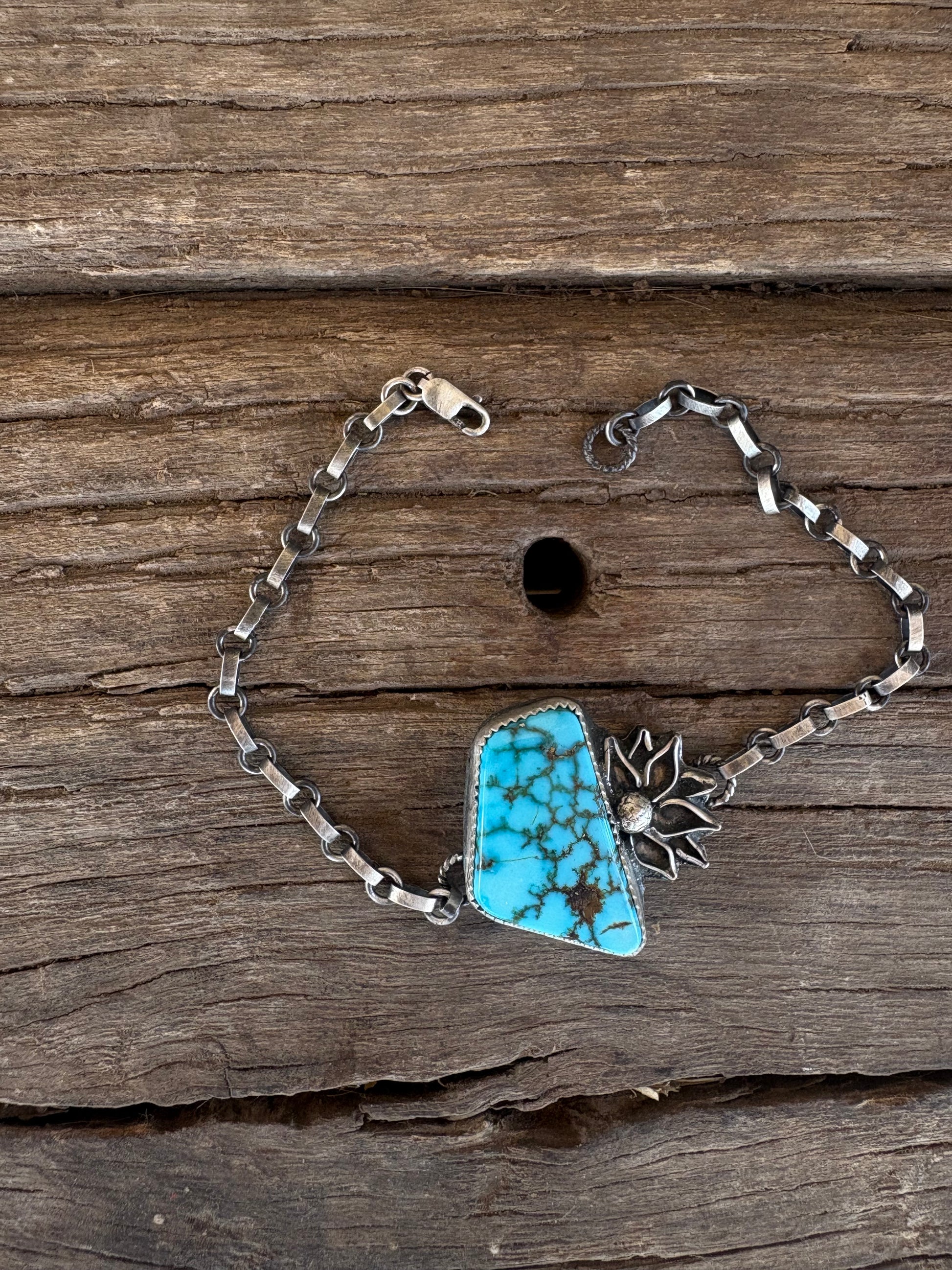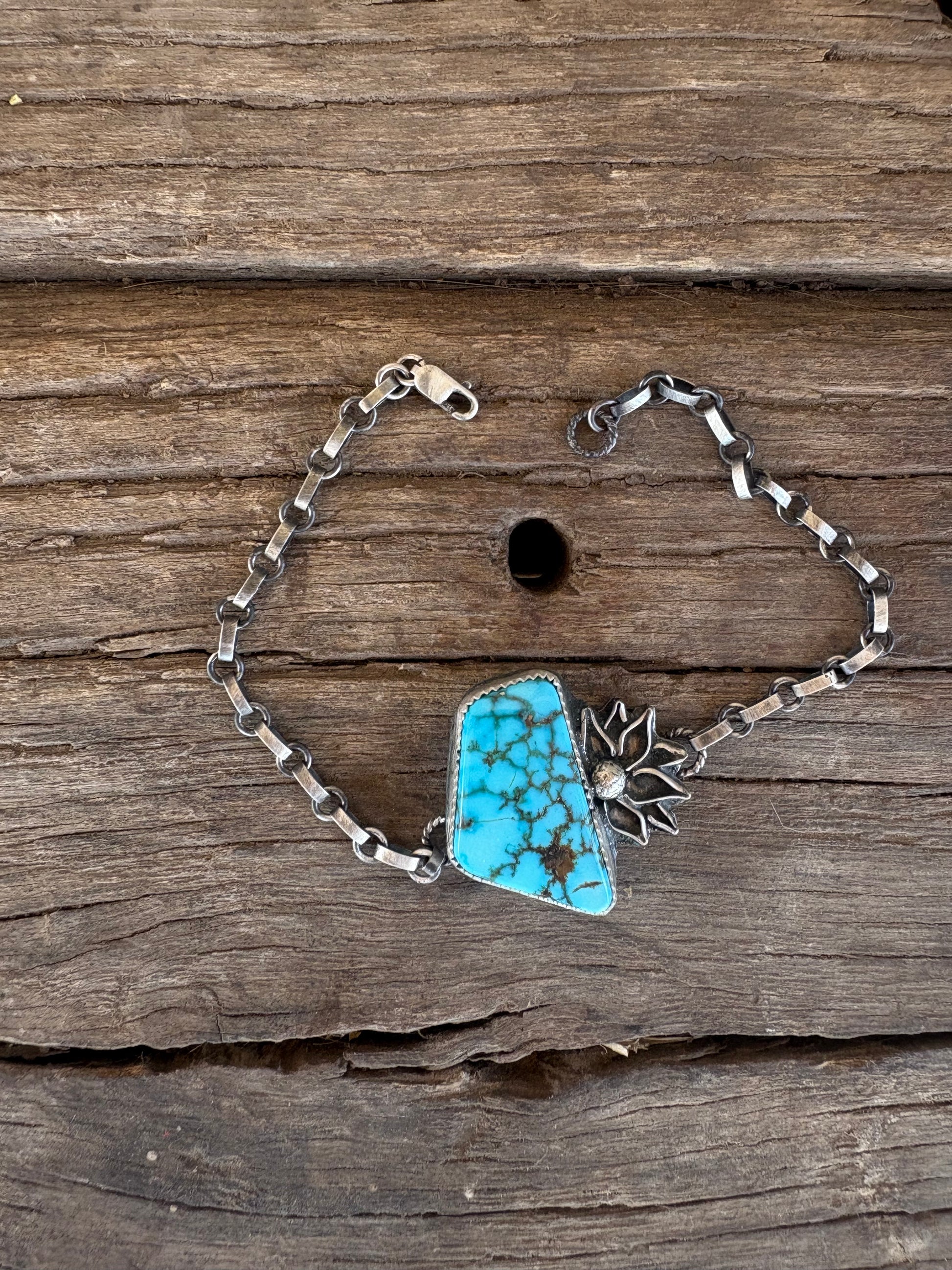 The “Alaura” is my new favorite bracelet I’m not gunna take off till it sells! She is made out of Turquoise Mountain turquoise with handmade little flower detail.