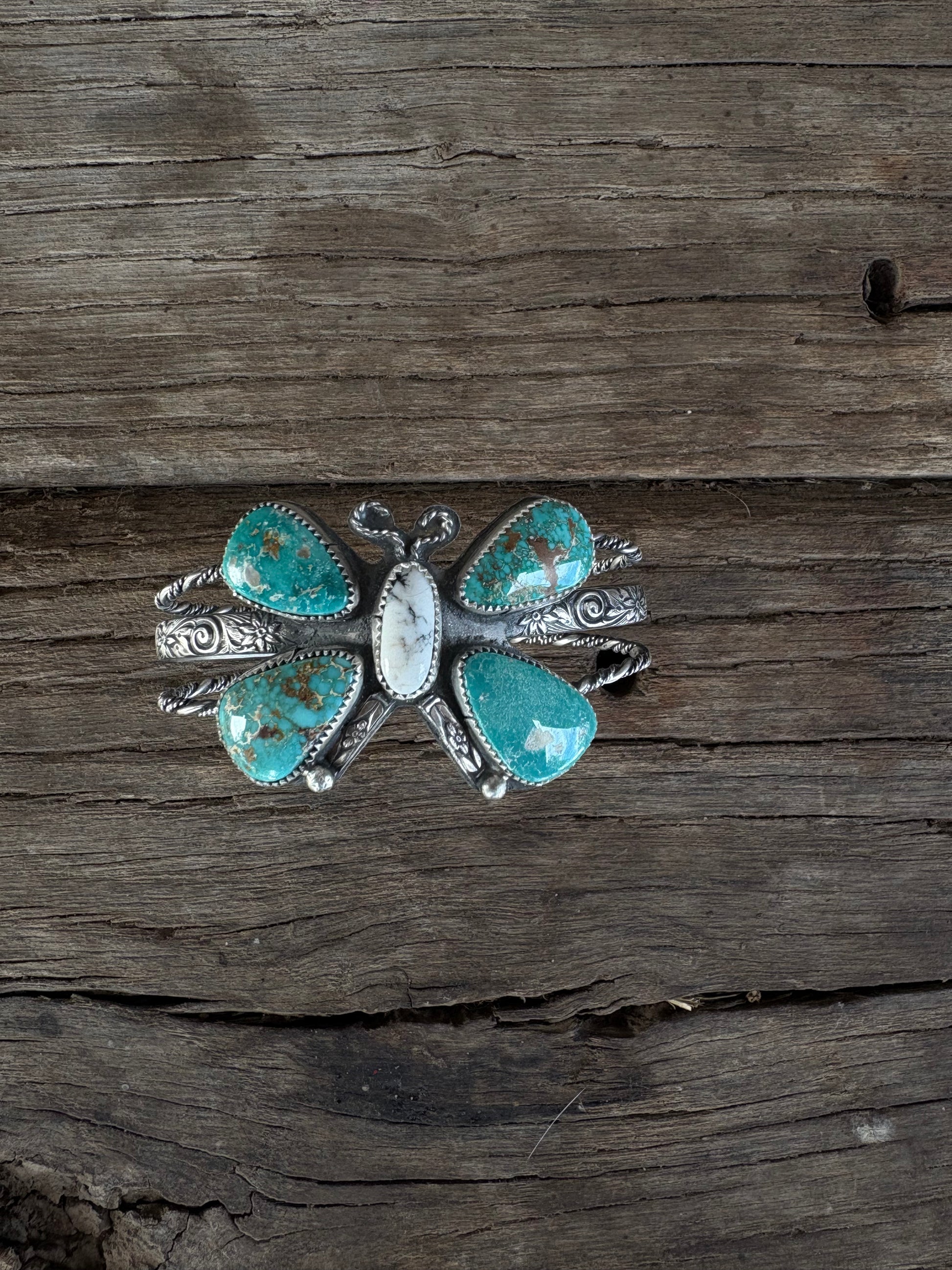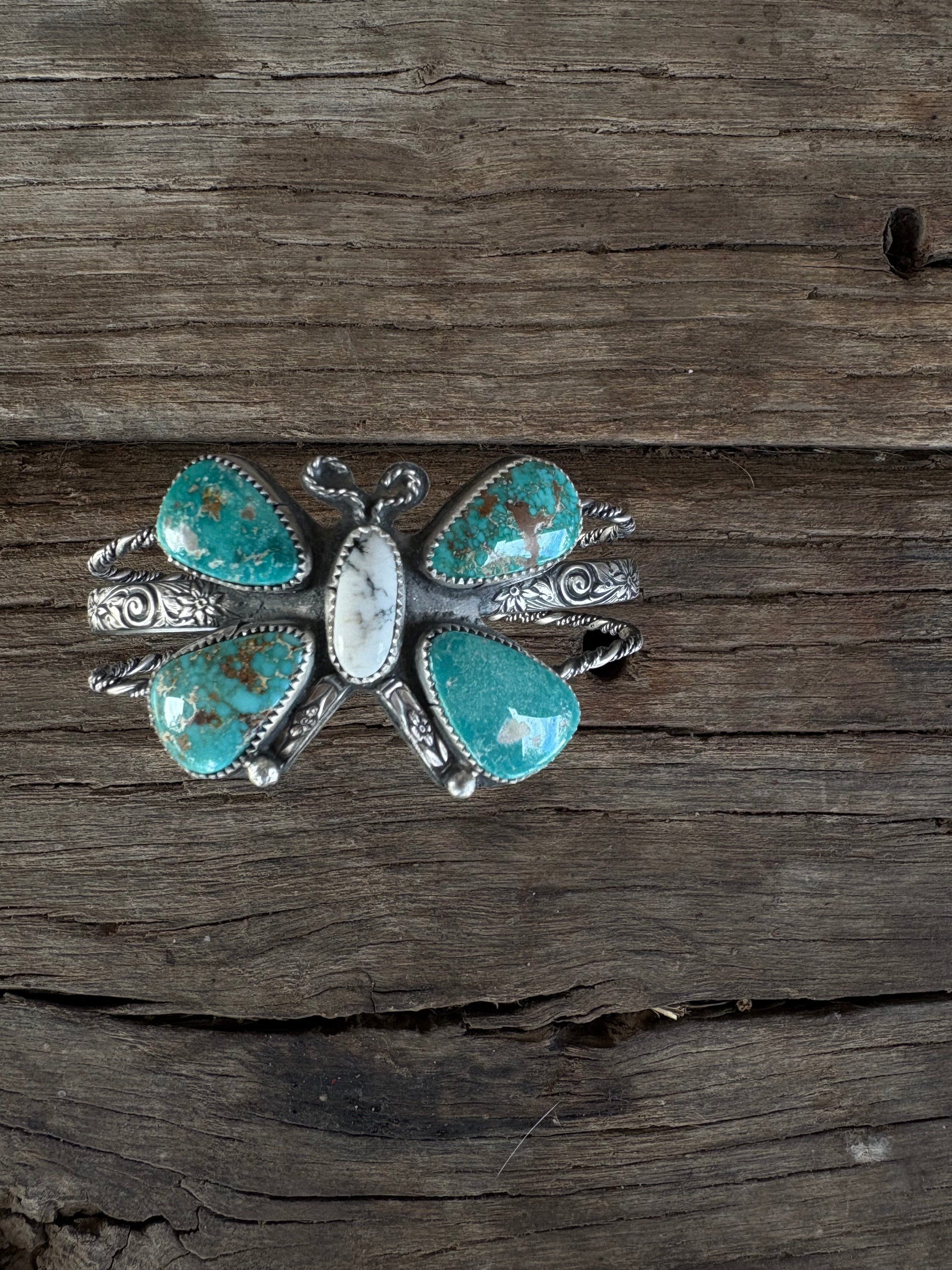 The “Harper” Butterfly Bracelet is my new obsession. This new stunner is made with White Buffalo center stone paired with Fox Turquoise all made in 20 gauge Sterling Silver.